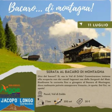 Dopo una sosta per ascoltare il suono dell’acqua e del bosco che si addormenta, riprenderemo il sentiero per raggiungere un luogo speciale: il Bàcaro di montagna, dove ci attende una gustosa cena in stile cicchetteria veneziana, servita in un ambiente semplice, autentico e accogliente, con vista sulle Dolomiti al chiaro di luna.